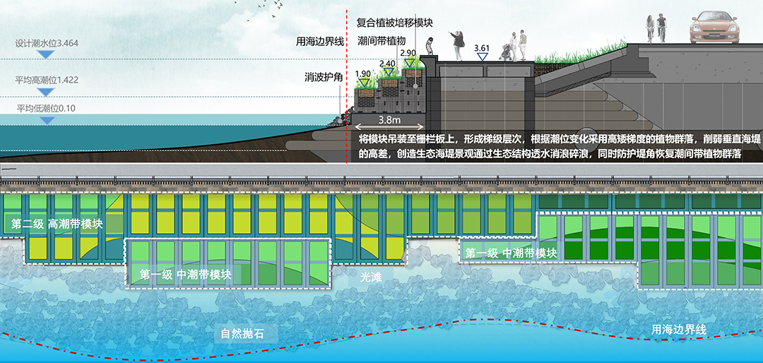 該模塊通過吊裝裝配方式科學構建4:6的灘林比,孔隙率較傳統(tǒng)海堤結構提升60%;同時精準“縫合”堤海界面,從陸向海梯度營造出鹽沼生境-半紅樹生境-紅樹生境-光灘潮汐生境-底棲生境多重潮間帶棲息空間,大幅提升海岸生態(tài)系統(tǒng)的多樣性與穩(wěn)定性。